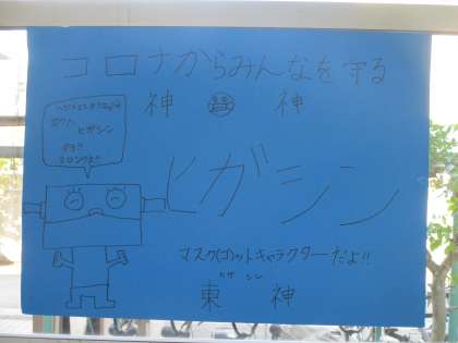 前期児童会役員が,最後の活動で「東神」を作ってくれました。「東神」は,コロナから学校のみんなを守るマスクキャラクターです。みんなが,コロナに負けず,元気で毎日にすごせるようにとの願いがこめられています。そこで作ってくれた前期児童会役員のみんなを「がんばる東っ子」として紹介します。ありがとう。よくがんばってくれました。