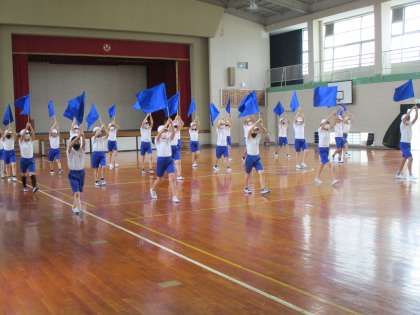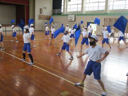 体育の時間です。今日は,5年生が一日臨海学校でいない,6年生だけの練習です。「フラッグダンス」の振り付けを先生のアドバイスをもらいなが確認。完成に向けてがんばりました。