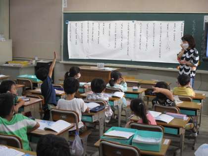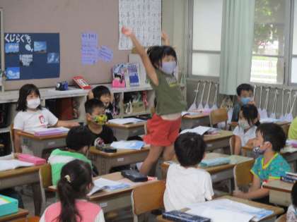 国語の時間です。「くじらぐも」の勉強をしています。今日は,「天までとどけ,1,2,3」の会話文を1年2組の子どもたちになって友だちと考えました。発表では,動きも入れながらうまく表現。きっと「くじらぐも」に乗れたと思います。