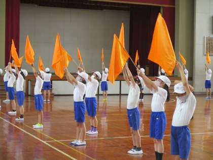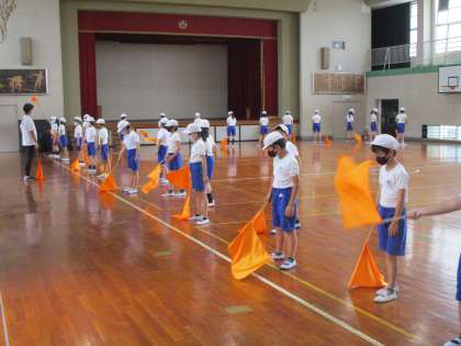 体育の時間です。今日は,5年生だけの練習です。「フラッグダンス」の振り付けを先生と確認。かっこよくできました。完成に向けてがんばっています。