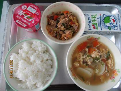 本日の献立は,ごはん,ミルク,トック,豚キムチ,ヨーグルの5品です。
