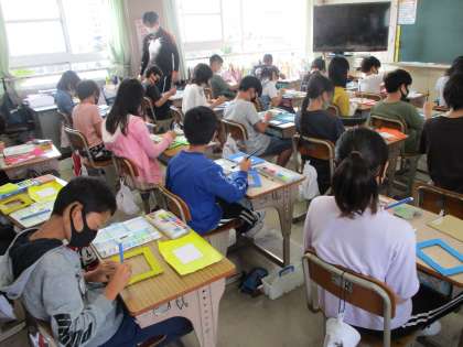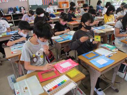 図工の時間です。写真のフレームづくりに取り組みました。自分のお気に入りの色に白の絵の具を散らしたすてきなフレーム。どんな写真を入れるのかな?