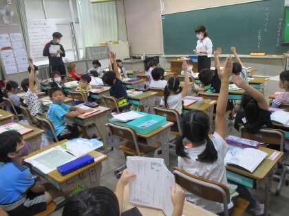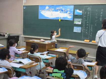 国語の時間です。「くじらぐも」を勉強しています。今日は4場面。「ふわふわしている」「町が小さく見える」など…イラストのくじらぐもにのっている1年2組のこの子になって,くじらぐもに乗った気持ちを考えました。楽しい勉強になりました。