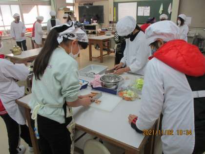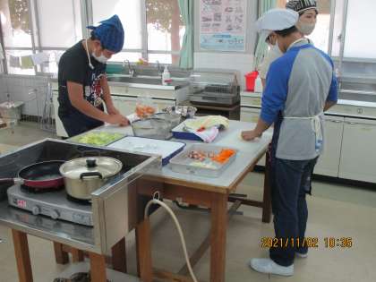 家庭科の時間です。調理実習に取り組みました。メニューは「野菜炒め」。食材を切ったり,炒めたりと段取りよく進めていました。