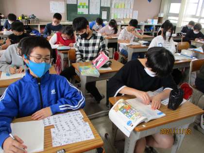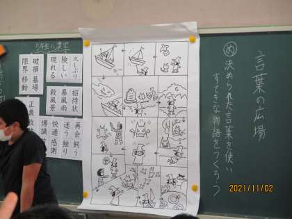 黒板に提示された熟語を使って,黒板に貼ってあるイラストの内容を示す文を作ってみました。