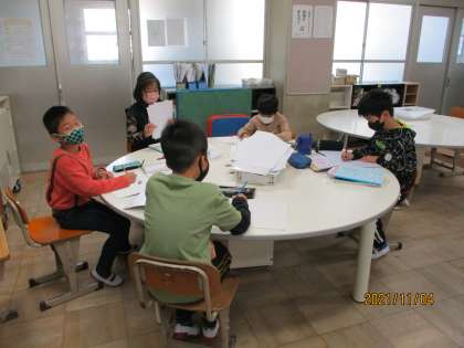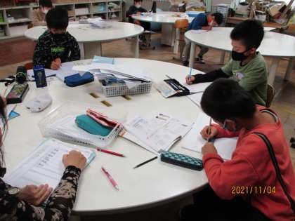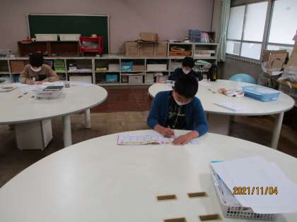 1時間目の学習の用紙です。算数や国語の課題に取り組んでいます。