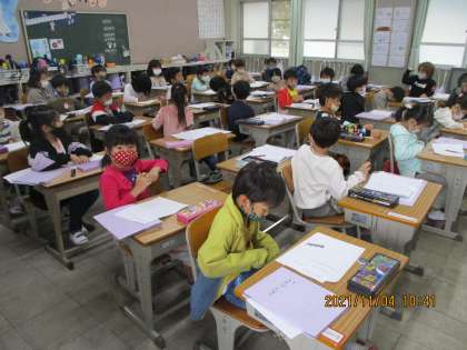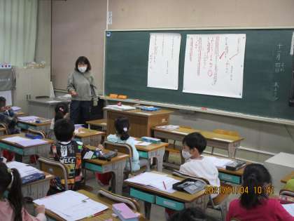 作文の授業です。友だちの書いた「50メートルそう」「うんどうかい たのしかった」の二つの作文を読み合いました。作文を読んで,感じたことや思ったことを話し合いました。盛り上がりまた。