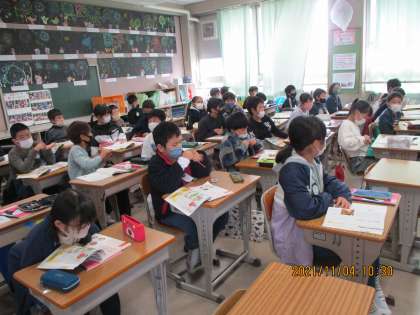 国語の時間です。「世界にほこる和紙。伝統工芸のよさを伝えよう」の勉強がスタート。めあては「中心となる語や文を要約し,調べたことを書こう」。先生の話から伝統工芸のことを確認。次の時間から内容に,詳しく取り組んでいきます。