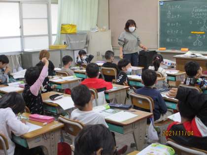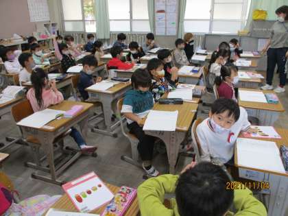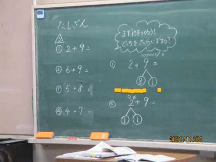 繰り上がりのあるたし算の学習が始まりました。今日はサクランボ算(どちらかの数を分けて10を作る計算)を仕方を学習しました。
