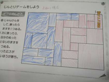 2人組で陣取りゲームをして,獲得した四角形の面積を比べました。