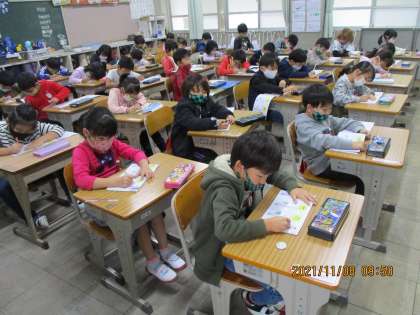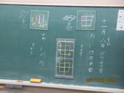 国語の時間です。今日は新しい漢字をしました。漢字は「田」「川」。書き順や言葉集めをしました。先生から「漢字を書くための気を付けるポイント」を教えてもらい,これで漢字がかっこよく書けます。