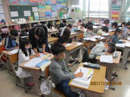 国語の時間です。漢字を勉強しました。今日の漢字は「歌」「心」「答」の3つ。気を付けるポイントや言葉集め,そのあと練習をしました。今日の3つの漢字,しっかり覚えることができたかな?