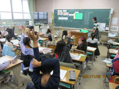 算数の時間です。「かけ算の九九」を勉強しています。めあては「9の段のひみつを見つけよう」。9の段の九九を確認。子どもたちは,いろいろな発見をしました。今日の9の段で九九を全部クリアーしました。