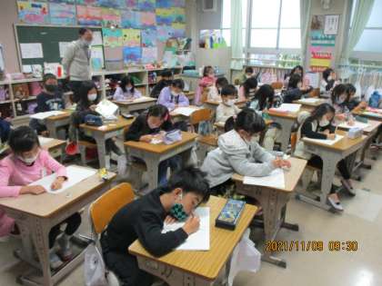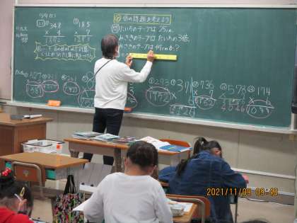 算数の時間です。「かけ算」の勉強中です。復習では「一,十,百の位の順で計算。くり上がりのたし算に気を付ける」を確認。計算問題をしました。今日のめあては「倍の問題を考えよう」。「何倍」が,かけ算のキーワードでした。