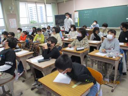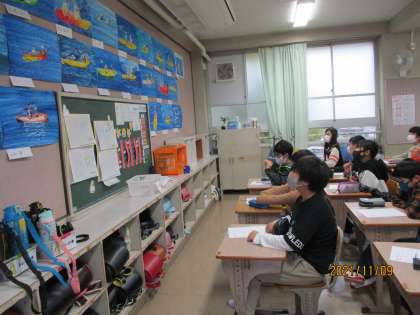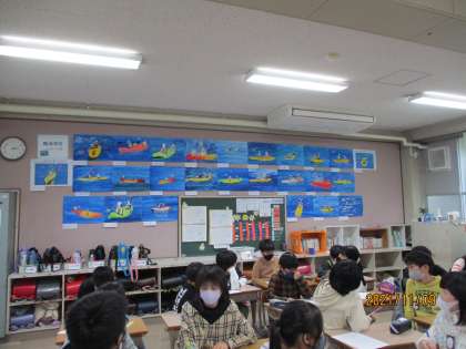 臨海学校でのカヌー体験の絵を見て,頑張ったところや友達の作品の良いところをワークシートに書きました。