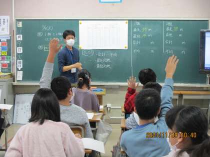 算数の時間です。「1組と2組の記録を比べよう」の課題に取り組みました。めあては「比べ方の種類を見つけよう」。合計,最高,平均など…どの比べ方が条件に合っているかを考えました。うまく比べ方見つかったかな?