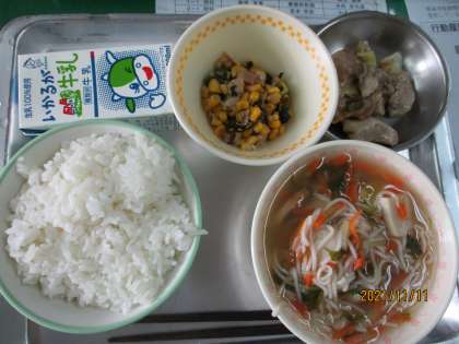 本日の献立は,ごはん,ミルク,にゅうめん汁,小松菜の炒め煮,塩やきとりの5品です。