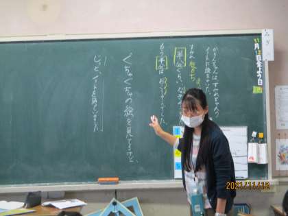 「わたしは おねえさん」の学習ですみれちゃんが自分のノートに妹のかりんちゃんが描いたぐちゃぐちゃの絵を見た時の思いについて話し合いました。