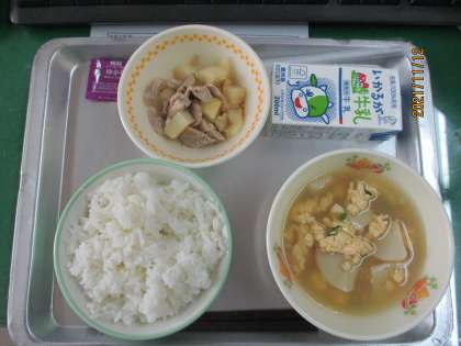 本日の献立は,ごはん,ミルク,長いものかきたま汁,みそマヨガーリック焼き,ふりかけの5品です。