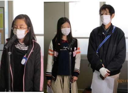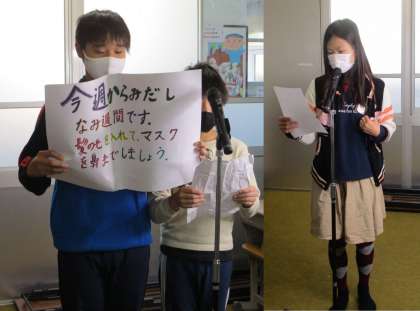 はじめに,校長先生が「学校生活で大切なことば」,「あいさつ,きれい,チャイム」について話をし,そのあと,1年生の作文「50メートルそう」の紹介をしました。次に給食委員会から「みだしなみ週間」のお知らせがありました。最後に児童会からb金おお知らせがありました。