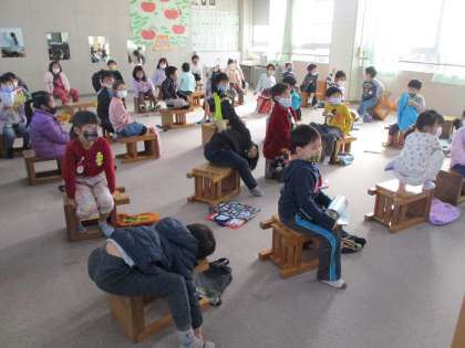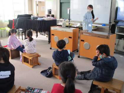 音楽の時間です。「やまびこさん まねっこさん」の歌を勉強しています。「やっほー」を「ケーキ」など…自分たちで歌詞を変えて歌いました。楽しそうに歌い,盛り上がりました。