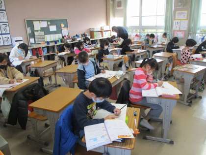 算数の時間です。「かけ算」を勉強しています。めあては「かけ算のたしかめをしよう」。教科書の問題にチャレンジ。「かけ算」のまとめに取り組みました。しっかり振り返りできたようです。