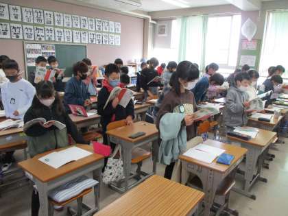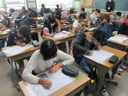 国語の時間です。はじめに「漢字のまとめ」テストに取り組みました。そのあと,「世界にほこる和紙」の7場面を勉強。要点まとめのために音読をしました。音読が内容のを読み取りにはいいようです。