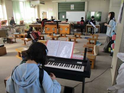 音楽の時間です。「Happiness」の合奏に取り組んでいます。全体の演奏の練習。前回よりもすごくうまくなっていました。練習の成果です。まだまだ演奏うまくなると思います。がんばってね。