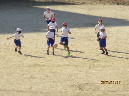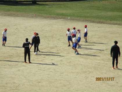 5・6年生は2時間目にセレッソの栄養士の方の食育の授業を受け,3時間目はセレッソのコーチの方からサッカーの指導を受けました。写真は男子の試合形式の練習の様子です。