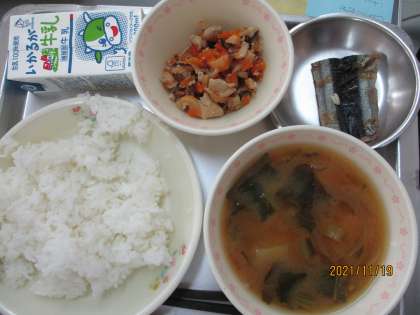 本日の献立は,ごはん,ミルク,みそ汁,セルフきのこごはんのもと,さんまの塩焼きの5品です。