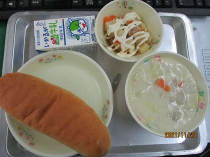 本日の献立は,コッペパン,ミルク,冬野菜のクリームシチュー,ポテトサラダマヨネーズ風ドレッシング添えの4品です。