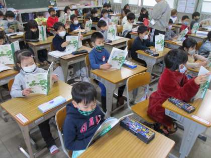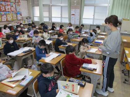 国語の時間です。「自動車くらべ」を勉強しています。はじめに,みんなで音読。しっかり声を出して読みました。「自動車くらべ」の勉強,やる気満々です。