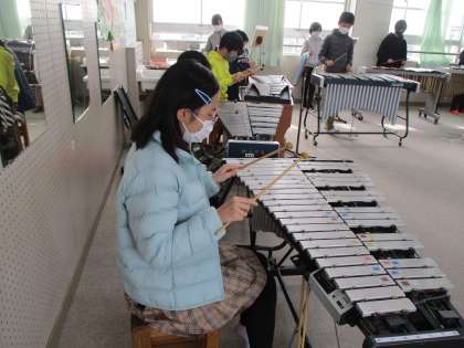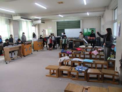 音楽の時間です。合奏で「Dynamite」に取り組んでいます。音楽室におじゃますると,ちょうど最後の通し練習をしていました。演奏の発表会に向けてがんばってます。