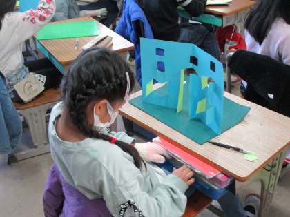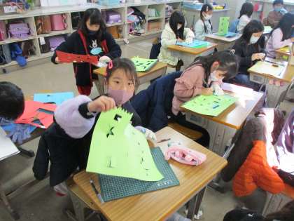 図工の時間です。「まどから こんにちは」に取り組んでいます。カッターで台紙にいろいろな楽しい窓を開けました。その窓から何が見えるかな?楽しい作品ができそうです。