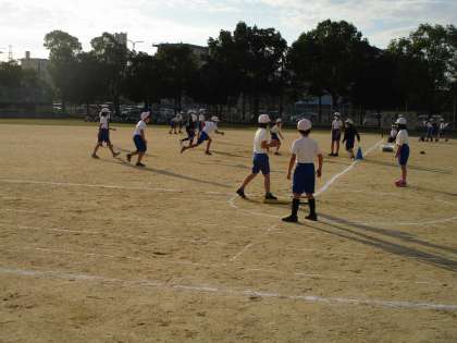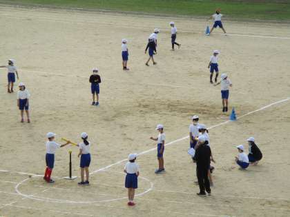 体育の時間です。「バッティング ゲーム」に取り組んでいます。チームに分かれて対戦,ゲームを楽しんでいました。子どもたち盛り上がっていました。