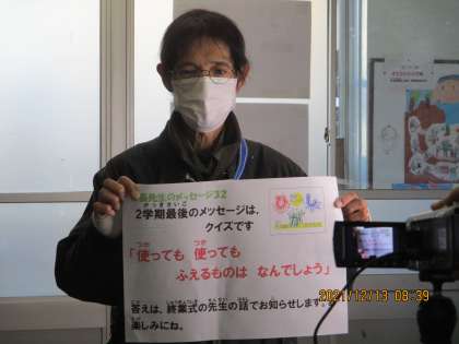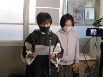 校長先生からクイズ「使っても使っても増えるのは何でしょう?」が出題されました。そのあと,5年生の作文「破壊神」と「かいだん(怪談or階段)」が紹介されました。最後に体育委員会から朝の駆け足で頑張った人が紹介されました。