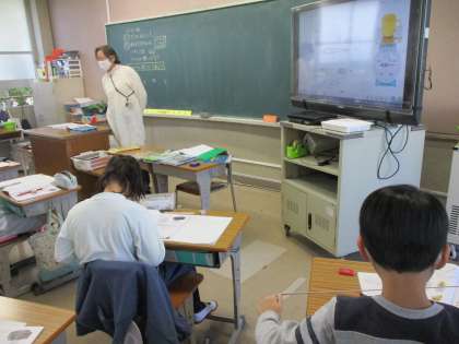 算数の時間です。「かさ」の勉強をしています。今回のめあては「重いものを はかろう」。「ランドセルをはかろう」の課題にチャレンジ。グループに分かれてランドセルの重さを量りました。ランドセルは何gあったかな?