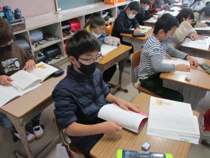 国語の時間です。お話の「プラタナスの木」を勉強しています。今回は4場面。前の時間にしっかり読み込み,場面の内容をノートにまとめて話し合いました。場面の内容をしっかり確認できたかな?