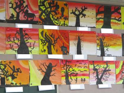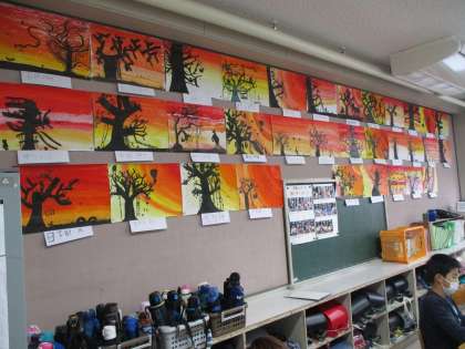 図工の「夕焼けの風景」が後ろに掲示してありました。グラデーションと黒をうまく使って,夕暮れの雰囲気をうまく表現。幻想的な作品に仕上がっていました。