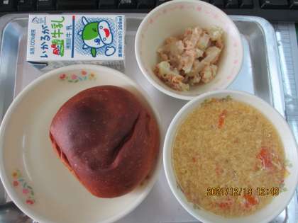 本日の献立は,黒糖きなこパン,ミルク,中華コーンス−プ,ツナとカリフラワーのマヨネーズ焼きの4品です。