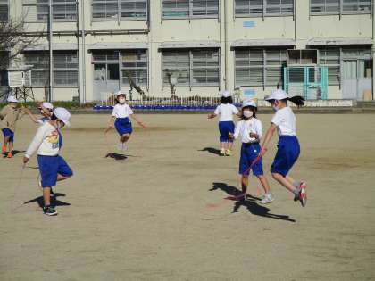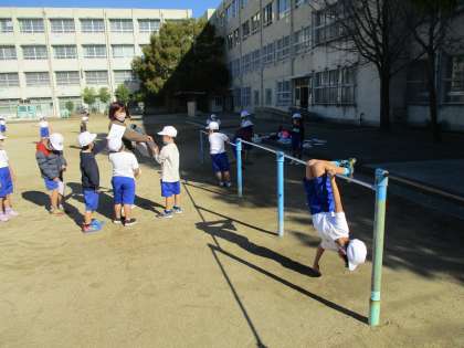 体育の時間です。鉄棒となわとびに取り組んでいます。「てつぼうとなかよく」と「なわとびカード」にチャレンジ。「おさるのおえかき」「かけあしとび」など…いろいろな技に取り組んでいました。できたら先生からシールをもらってうれしそうでした。がんばりましたね。