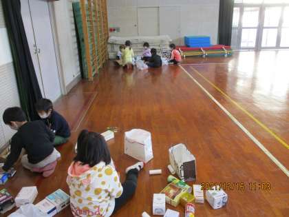 空き箱や体育館の道具を使って遊園地を作りました。