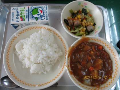 本日の献立は,カレーライス,ミルク,小松葉サラダ手作りドレッシング和えの3品です。