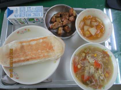 本日の献立は,コッペパン,ミルク,マカロニスープ,タンドリーチキンポテト,とろりフルーツコンポートの5品です。