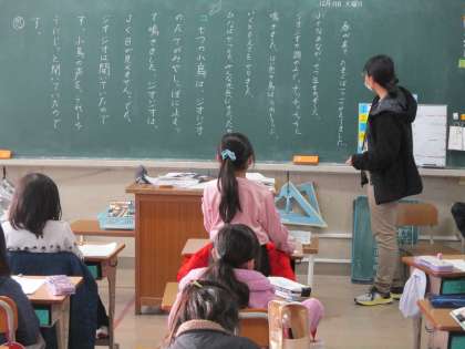国語の時間です。「ジオジオの冠」を勉強しています。七つの小鳥たちとの場面で,ライオンジオジオの気持ちを考えました。ジオジオの気持しっかり読み取っていました。