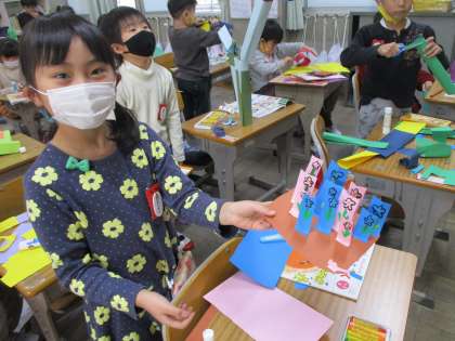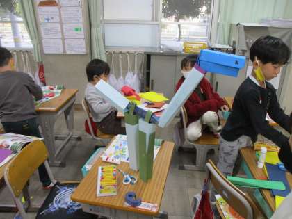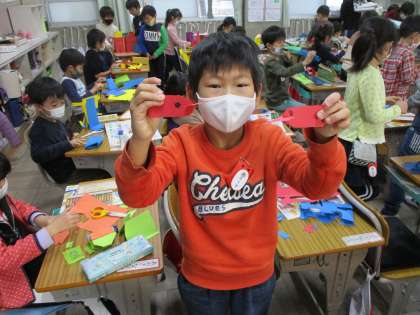図工の時間です。「おってたてたら」の勉強をしました。いろいろな色の色画用紙を折って,立てて立体の作品にチャレンジ,恐竜,電車など…自分なりに工夫をして作品を作りました。どれも素敵で,楽しい作品です。