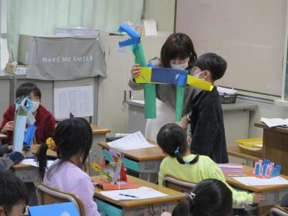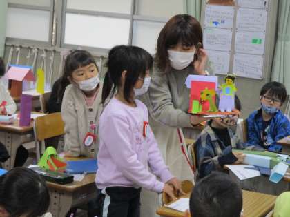 図工の時間です。前の時間に取り組んだ「おってたてたら」の作品を友だちに紹介。自分なりに工夫をしたポイントを伝えました。少し恥ずかしそうでしたが,先生にサポートしてもらいながらがんばって発表できました。