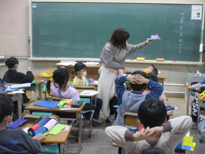 「「おってたてたら」の作品を友だちに紹介」(1年生)