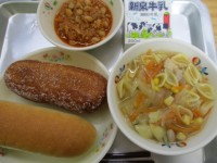 本日の献立は,ミニコッペパン,揚げパン,ミルク,ビーフンスープ,肉団子のケチャップ煮の5品です。