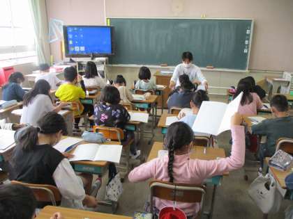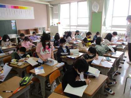 学級開き三日目。算数の時間です。計算ドリルを配ってもらいました。今日は,3年生の復習のページにチャレンジ。新しいノートを使って取り組みました。復習しっかりできたかな?